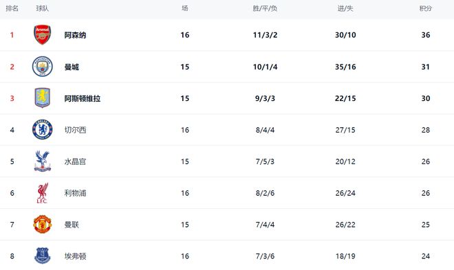 在积分榜上,阿森纳以36分继续领跑。曼城少赛一场,以31分排名第2。第3的是阿斯顿维拉,拿到30分。切尔西赢球之后,暂时杀入了欧冠区,28分排名第4。水晶宫和利物浦都是26分,排名第5和第6。曼联以25分排名第7。第8的是埃弗顿,拿到24分。热刺和纽卡斯尔联只拿到22分,排名第11和第12。